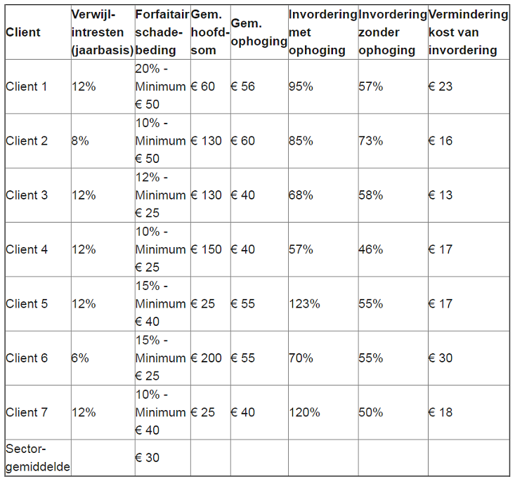 Een door Intrum uitgevoerde benchmark wijst uit dat het effectief toepassen van de in uw algemene voorwaarden gestipuleerde verwijlintresten en forfaitair schadebeding het gemiddeld percentage van succesvolle invordering per dossier gevoelig verhoogt.